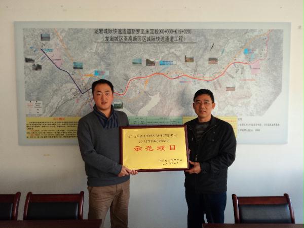 1月19日下午,龙岩市交通运输局受福建省公路管理局委托,为集团公司投资建设的龙岩城际快速通道项目举行“2014年普通干线公路标准化典型示范项目”现场授牌仪式。交通局领导对2014年度项目履约工作予以高度评价,并希望双方能够继续精诚合作,实现共赢。