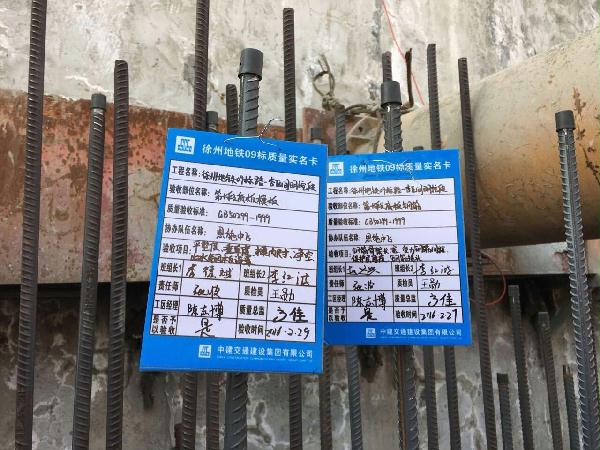近日,徐州地铁1号线09标的施工现场,你会看到许多施工环节都挂上了一张张质量实名卡,让每个施工环节的验收标准、验收人、各相关责任人一目了然。这是徐州地铁09标为响应集团公司提出的加强质量管理的要求,采取的质量严控措施,建立的质量可追溯体系。