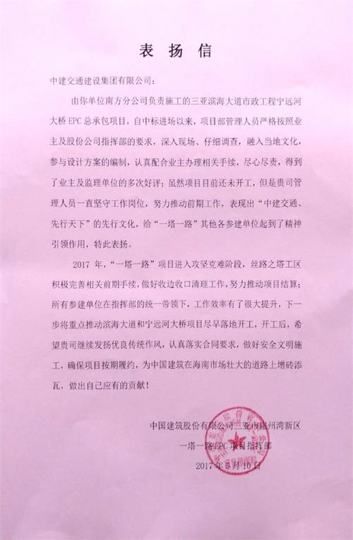 近日,股份公司三亚市崖洲湾新区一塔一路EPC项目指挥部书面表扬了中建交通宁远河大桥项目中标进场后的各项前期工作。